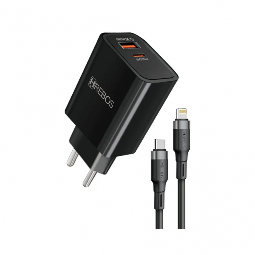 CARREGADOR HREBOS POWER TURBO,USB-C+USB-A 20W C/CABO LIGHTNING